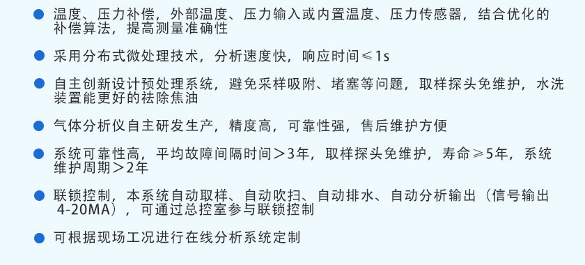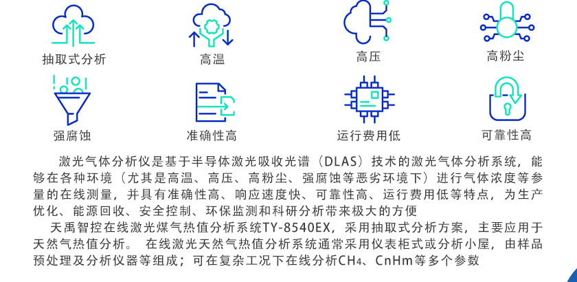 激光氣體分析儀是基于半導體激光吸收光譜(DLAS)技術的激光氣體分析系統,能夠在各種環境(尤其是高溫、高壓、高粉塵、強腐蝕等惡劣環境下)進行氣體濃度等參量的在線測量,并具有準確性高、響應速度快、可靠性高、運行費用低等特點,為生產優化、能源回收、安全控制、環保監測和科研分析帶來極大的方便,在鋼鐵冶金、石油化工、環境保護和能源電力等行業已得到廣泛的應用。 天禹智控在線激光煤氣熱值分析系統TY-8540EX,采用抽取式分析方案,主要應用于天然氣熱值分析。 在線激光天然氣熱值分析系統通常采用儀表柜式或分析小屋,由樣品預處理及分析儀器等組成;可在復雜工況下在線分析CH?、CnHm等多個參數,針對現場
