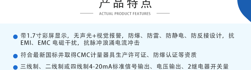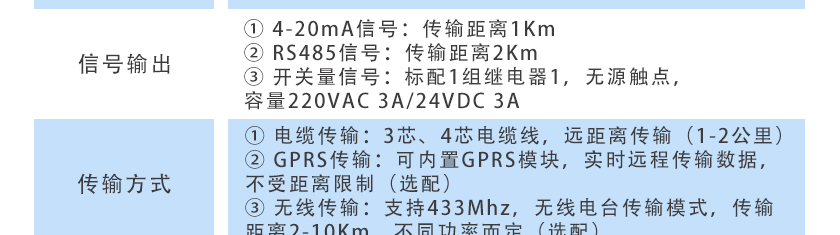 ①4-20mA信號傳輸距離1Km ②RS485信號傳輸距離2Km