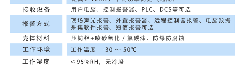 現場聲光報警、外置報警器、遠程控制器報警、電腦數據采集軟件報警、短信報警可選