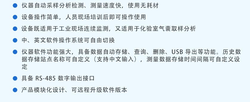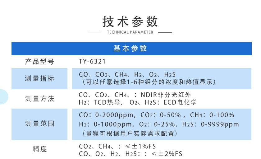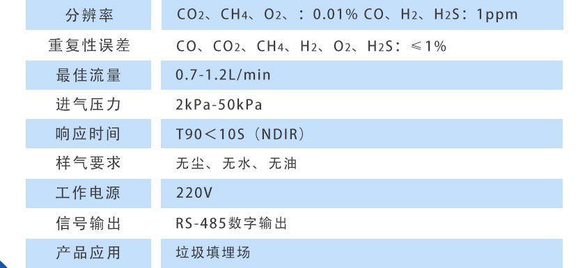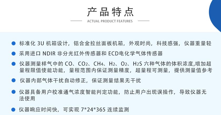 CO、CO2、CH4、:NDIR非分光紅外 H2:TCD熱導(dǎo), O2、H2S:ECD電化學(xué) |