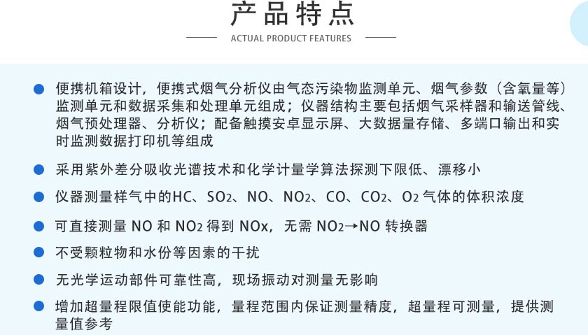 該分析儀基于紫外差分吸收光譜技術(DOAS)、NDIR非分光紅外技術和電化學技術,能夠測量HC、SO2、NO、NO2、CO、CO2、O2等氣體濃度。