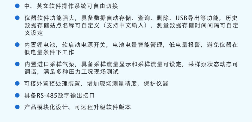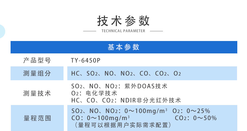 SO2、NO、NO2:0~100mg/m3;O2:0~25%;CO:0~100mg/m3;CO2:0~50%;(量程可以根據用戶實際需求配置)