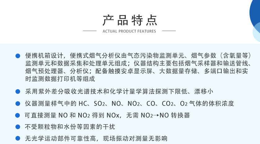 該分析儀基于紫外差分吸收光譜技術(DOAS)、NDIR非分光紅外技術和電化學技術,能夠測量HC、SO2、NO、NO2、CO、CO2、O2等氣體濃度。