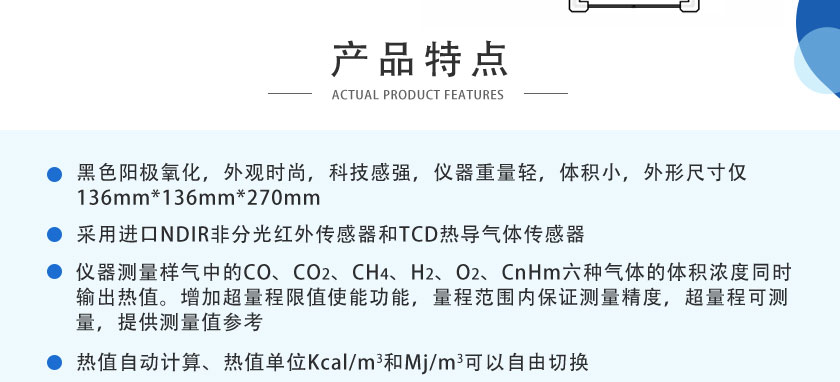 采用國際先進(jìn)的NDIR非分光紅外技術(shù)和基于MEMS的TCD熱導(dǎo)技術(shù),主要用于測量各種生物燃?xì)庵械腃O、CO2、CH4、H2、O2、CnHm?等六種氣體體積濃度及熱值。測量精度高、結(jié)構(gòu)簡單、維護(hù)方便,軟件功能強(qiáng)大,可拓展性強(qiáng)、現(xiàn)場實(shí)用性好,目前暢銷國內(nèi)外。適用于生物氣化、發(fā)生爐煤氣、生物燃?xì)獾瓤扇細(xì)怏w不同成分的體積濃度和熱值。