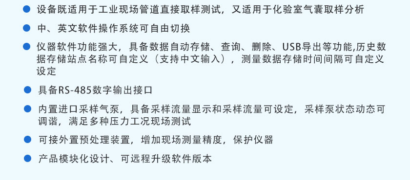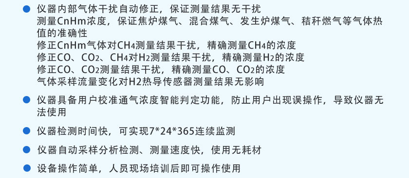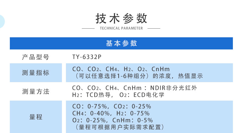 CO、CO2、CH4、CnHm :NDIR非分光紅外;H2:TCD熱導(dǎo), O2:ECD電化學(xué) |