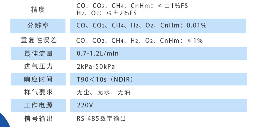 CO、CO2、CH4、CnHm:≤±1%FS;H2、O2:≤±2%FS |