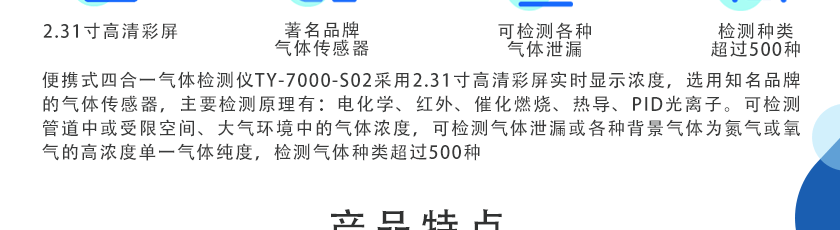 CO(0~1000ppm)、H2S(0~100ppm)、O2(0~30%Vol)、Ex(0~LEL)、CO2(0~5000ppm)、NOX(0~1000ppm),其他量程可訂制