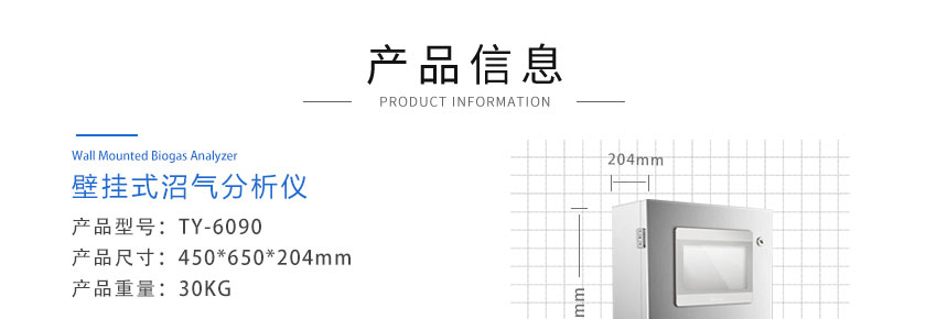 • 防爆壁掛式沼氣分析系統 TY-6090EX 采用進口NDIR非分光紅外傳感器,長壽命電化學傳感器,運用先進的數字處理技術,可同時測量沼氣中CH4、CO2、H2S、O2、CO、H2的體積濃度,根據氣體濃度值快速準確計算出相應的熱值。