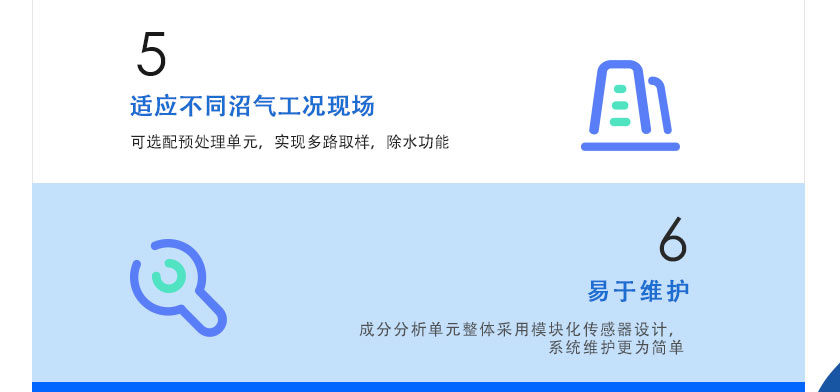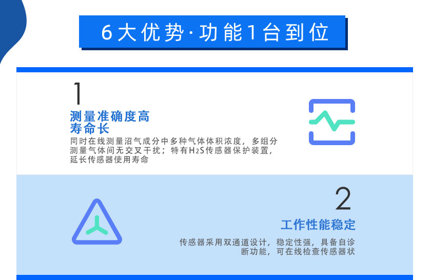 采用進口NDIR非分光紅外傳感器,長壽命電化學(xué)傳感器,運用先進的數(shù)字處理技術(shù),可同時測量沼氣中CH4、CO2、H2S、O2、CO、H2的體積濃度,根據(jù)氣體濃度值快速準確計算出相應(yīng)的熱值。