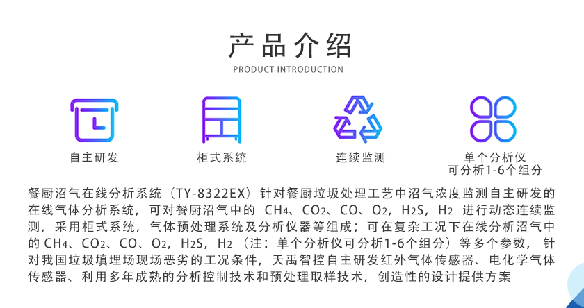 針對餐廚垃圾處理工藝中沼氣濃度監測自主研發的在線氣體分析系統,可對餐廚沼氣中的CH4、CO2、CO、O2,H2S,H2進行動態連續監測。 餐廚沼氣在線分析系統(TY-8322EX)采用柜式系統,氣體預處理系統及分析儀器等組成;可在復雜工況下在線分析沼氣中的CH4、CO2、CO、O2,H2S,H2(注:單個分析儀可分析1-6個組分)等多個參數。 針對我國垃圾填埋場現場惡劣的工況條件,天禹智控自主研發紅外氣體傳感器、電化學氣體傳感器、利用多年成熟的分析控制技術和預處理取樣技術,創造性的設計提供方案。