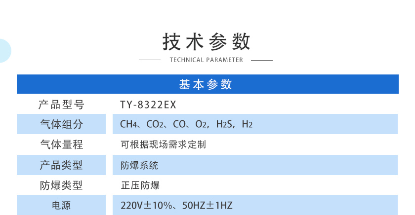 • 防爆壁掛式沼氣分析系統 TY-6090EX 采用進口NDIR非分光紅外傳感器,長壽命電化學傳感器,運用先進的數字處理技術,可同時測量沼氣中CH4、CO2、H2S、O2、CO、H2的體積濃度,根據氣體濃度值快速準確計算出相應的熱值。