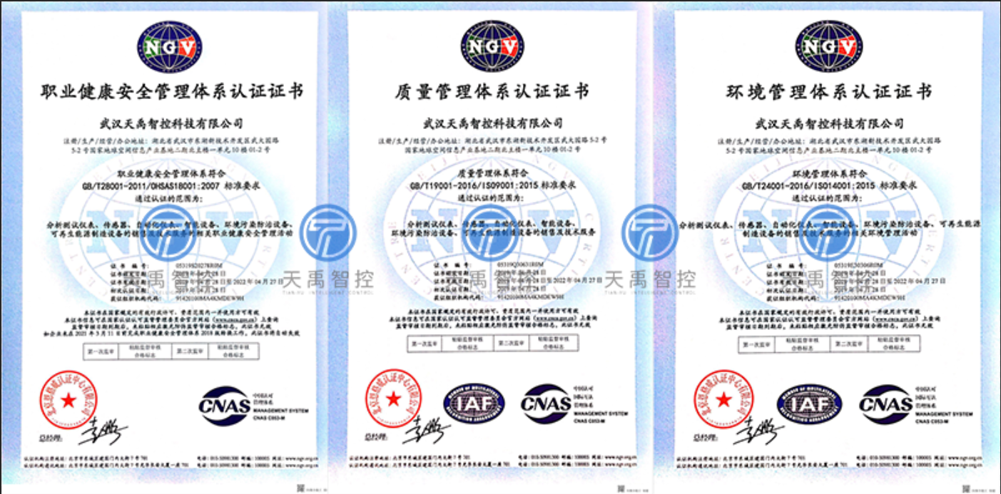 2019年4月29日,天禹智控獲得了ISO9001質量管理體系認證證書、ISO14001環境管理體系認證、OHSAS18001職業健康安全管理體系認證證書。據了解, ISO9001標準是許多經濟發達國家實施質量管理的經驗總結。ISO14001環境管理體系標準是創建綠色企業的有效工具,對企業持續地開展環境管理工作及對企業的可持續發展起到有效地推動作用。OHSAS18001該標準為各類組織提供了結構化的運行機制,幫助組織改善安全生產管理,推動職業健康安全和持續改進。它們具有普遍性、通用性和指導性。