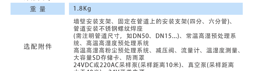墻壁安裝支架、固定在管道上的安裝支架(四分、六分管)、管道安裝不銹鋼螺紋焊座 (需注明管道尺寸,如DN50、DN15...)、常溫高濕預(yù)處理系統(tǒng)、高溫高濕度預(yù)處理系統(tǒng)、 高溫高濕高粉塵預(yù)處理系統(tǒng)、減壓閥、流量計(jì)、溫濕度測量、大容量SD存儲卡、防雨罩、 24VDC或220AC采樣泵(采樣距離10米)、真空泵(采樣距離大于40米)、24V開關(guān)電源 |