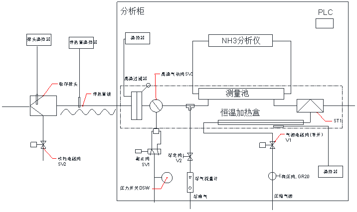 如系統(tǒng)流程圖所示,樣氣經(jīng)采樣探頭,由采樣伴熱管輸送至預(yù)處理單元,預(yù)處理單元包括常閉型高溫閥SV1,精密過濾器、射流泵,其中SV1閥用于在停止采樣時切斷氣路,精密過濾器用于進(jìn)一步凈化樣氣,去除樣氣中的粉塵等,射流泵則用于提供樣氣傳輸時的動力,系統(tǒng)由PLC控制實際自動周期采樣及吹掃。所有樣氣流經(jīng)元件及管路均置于恒溫加熱盒中,防止管路被銨鹽堵塞,減少樣氣損失。