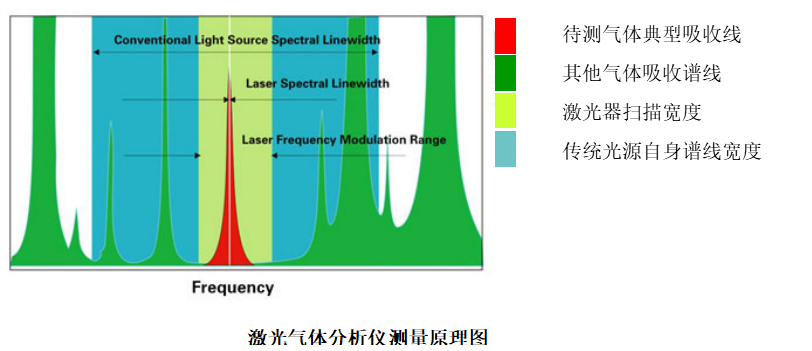 2.4.2 優(yōu)點可調(diào)諧半導(dǎo)體激光光譜吸收技術(shù)TDLAS本質(zhì)上是一種光譜吸收技術(shù),通過分析激光被氣體分子的選擇性吸收來獲得氣體的濃度。它與傳統(tǒng)紅外光譜吸收技術(shù)的不同之處在于,半導(dǎo)體激光光譜寬度遠(yuǎn)小于氣體吸收譜線的展寬,如上圖。因此,半導(dǎo)體激光吸收光譜技術(shù)是一種高分辨率的光譜吸收技術(shù)。系統(tǒng)采用特定波長的激光束穿過被測氣體,激光強(qiáng)度的衰減與氣體的濃度滿足朗伯.比爾定理,因此可以通過檢測激光強(qiáng)度的衰減信息分析獲得被測氣體的濃度。采用半導(dǎo)體激光吸收光譜技術(shù)的激光氣體分析儀可從原理上抗背景氣體的干擾,測量結(jié)果可靠性高。
