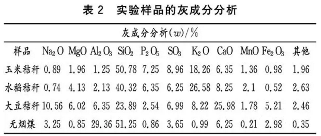 由表1可知,不同生物質(zhì)的組分以及含量有較大的差異,生物質(zhì)與煤相比而言,氧含量較豐富,而無煙煤中的碳含量遠(yuǎn)高于生物質(zhì),因此,將煤與生物質(zhì)共氣化可以實(shí)現(xiàn)元素的綜合利用。同時,生物質(zhì)中含有較多的K、Ca、Na等堿土金屬元素,對于煤的氣化具有較強(qiáng)的催化作用。實(shí)驗(yàn)樣品的灰分分析如表2所示。