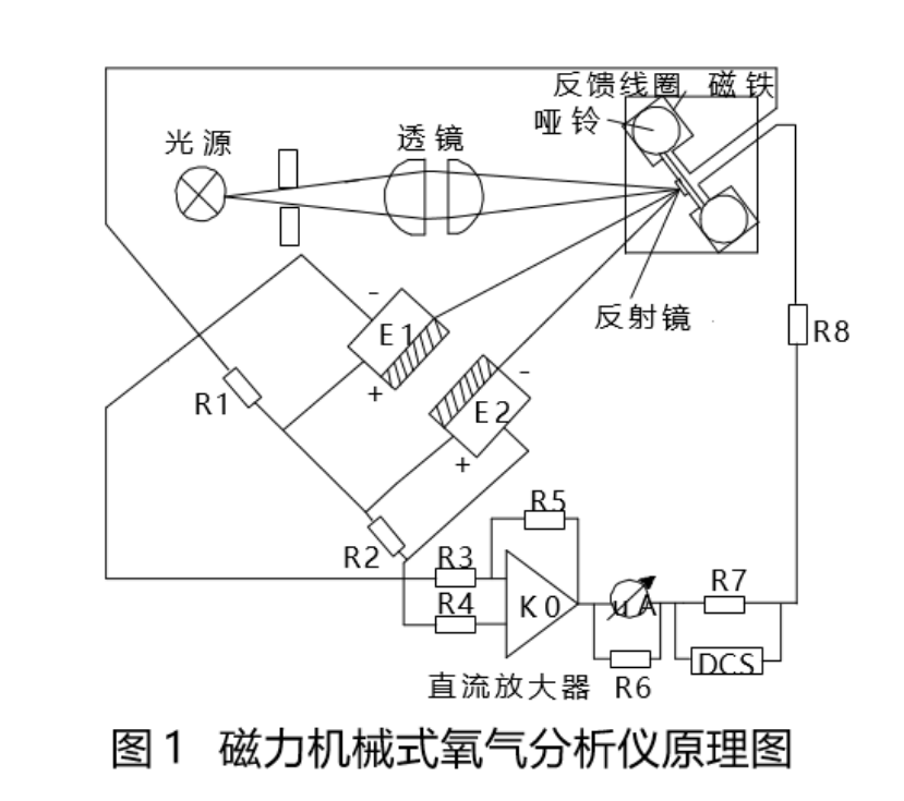 1.1磁機(jī)械式氧分析原理:由于氧氣分子具有較強(qiáng)的順磁性,氧氣分子會向著磁場增強(qiáng)的方向移動。通過兩種不同的氧含量氣體在磁場作用下所形成的的壓力差,并根據(jù)機(jī)械原理采用一根極為靈敏的鋼絲來懸吊啞鈴球,兩種不同的氧含量氣體在磁場中的壓力差會使偏移,而啞鈴球偏轉(zhuǎn)角度與混合氣體中含氧量濃度成正比,并由特定的光源、反射鏡以及感光原件所組成單元準(zhǔn)確地測定出啞鈴球的偏轉(zhuǎn)角度,進(jìn)而確定混合氣體中氧含量的百分比。
