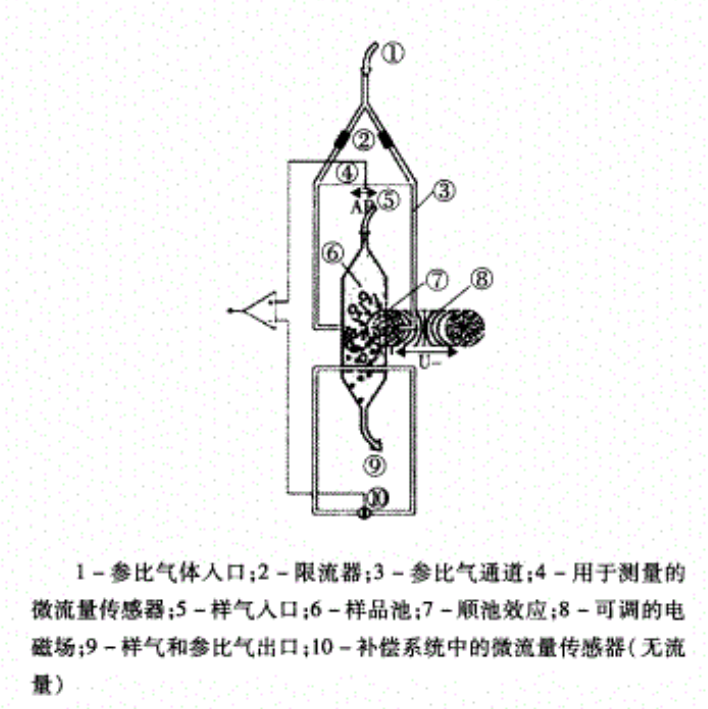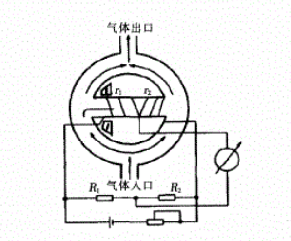 在一個中間有通道的環(huán)形氣室內(nèi),外面均勻繞著電阻絲,電阻絲通入電流后既起到加熱的作用,同時又是測量溫度變化的感溫元件。電阻絲從中間一分為二,作為兩個相鄰的橋臂電阻r1、r2,與固定電阻R1、R2組成測量電橋。在中間通道的左側(cè)設(shè)置一對小電極,以形成恒定的不均勻的磁場。待測氣體從底部人口進(jìn)人環(huán)形氣室后,由于受到磁場的吸引而進(jìn)入水平通道,當(dāng)它處于磁場強(qiáng)度最大的區(qū)域時,也同時被電阻絲加熱。在加熱區(qū)被測氣體溫度升高,電阻絲溫度降低。被加熱的氣體由于溫度升高,體積磁化率將急劇下降,受磁場的吸引力也就大為減弱。而其后冷態(tài)的順磁性氣體在磁場的作用下繼續(xù)被吸引到磁場強(qiáng)度最大的區(qū)域,這就對先前已受熱的順磁性氣體產(chǎn)生向右方向的推力,使其流動而脫離磁場區(qū)域。如此周而復(fù)始,形成"磁風(fēng)"。當(dāng)被測氣體的磁化強(qiáng)度(即氧含量)越大,形成的"磁風(fēng)"越強(qiáng),帶走電阻絲的熱量就越多,電阻絲的阻值就變化越大,阻值的變化與被測氣體中的氧含量呈正比關(guān)系,因此可對被測氣體中的氧含量進(jìn)行測量。