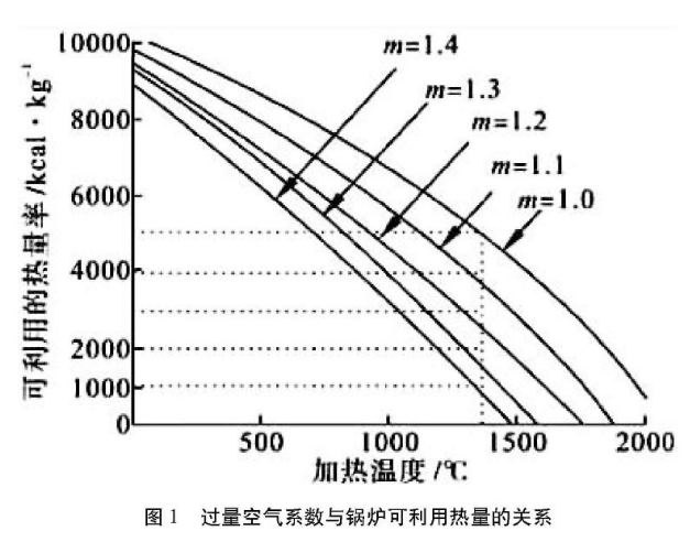 燃?xì)忮仩t運(yùn)行中,過(guò)量空氣系數(shù)的選取非常重要,過(guò)量空氣少了會(huì)導(dǎo)致燃燒不完全,增加Q3熱損失;過(guò)量空氣多了會(huì)降低煙氣的輻射能力,受熱面的利用率降低,更為重要的是過(guò)量空氣的多少會(huì)直接影響鍋爐熱效率。本改造項(xiàng)目中,由于燃料主要是燃點(diǎn)較高的高爐煤氣,為保證燃燒完全,采用了較高的過(guò)量空氣系數(shù)。但當(dāng)采用富氧燃燒時(shí),由于火焰溫度提高,燃料燃點(diǎn)在富氧條件下也有所降低,因此可以采用較低的過(guò)量空氣系數(shù)(見(jiàn)表1)。研究表明,過(guò)量空氣系數(shù)越低,鍋爐可利用熱量越高(見(jiàn)圖1)。所以在采用富氧燃燒的鍋爐中,取較低的過(guò)量空氣系數(shù),既可以保證燃燒完全,又可以減少排煙熱損失,鍋爐效率明顯提高。