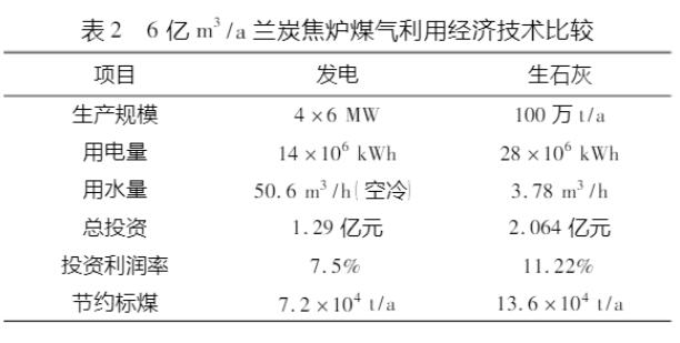 蘭炭焦爐煤氣脫硫后用于發電,以及作為生石灰、金屬鎂、水泥等工業窯爐的燃料。以60萬t/a蘭炭廠蘭炭焦爐煤氣為例,60萬t蘭炭廠每年生產蘭炭焦爐煤氣約6億m3。這些蘭炭焦爐煤氣可提供4套6MW發電機組的燃料需求,或100萬t/a生石灰生產燃料需要。具體經濟技術比較見表2。